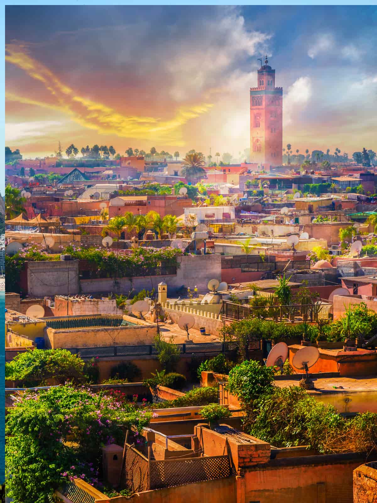 Marrakech es magia, cultura y elegancia en estado puro, un lugar donde los palacios de tonos ocres, los jardines perfumados y los mercados vibrantes se mezclan con la serenidad del desierto. Sus riads llenos de arte, la exquisita gastronomía marroquí, los atardeceres sobre la plaza Jemaa el-Fna y la majestuosidad de la Medina crean una atmósfera única, sofisticada y profundamente inspiradora.